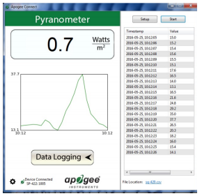 SP-420還內置數據存儲芯片,無需其他記錄儀或計算機,即可自動記錄10000個測量數據,方便了您的使用。傳感器電纜標配USB 2.0接口,可以方便地連接各種類型的電腦。通過配備的Apogee軟件即可輕松對測量數據進行實時顯示數據圖形。它還創新性地采用了5V DC USB供電方式,使其工作方式異常多樣性,您不僅可以將其直接插到計算機的USB接口上,還可以通過普通的USB電源適配器來直接使用220V交流電,您甚至可以使用移動設備常用的移動電源(充電寶)為其提供工作電力。