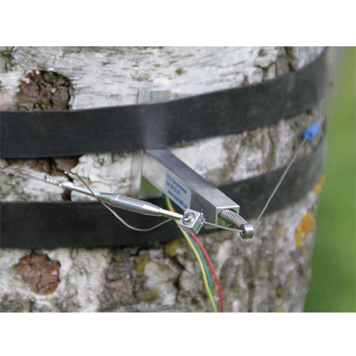 DC2樹干周長生長變化記錄儀是DC1樹干周長生長變化記錄儀的改進版本。鋼絲繩的拉力改為徑向設置。這樣鋼絲繩對樹的壓力和樹徑無關,不同樹徑的測量結果可直接比較。傳感器通過一個由熱膨脹系數低的合金制成的鋼絲繩固定在樹上。用小塑料環減少鋼絲繩對樹的壓力,并減少摩擦阻力,大大提高靈敏度。